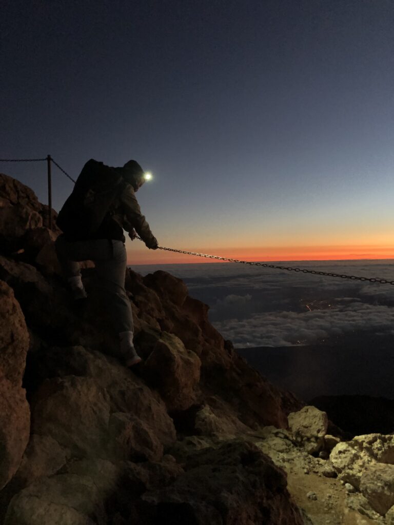 Równo 3:00 w nocy wyruszamy na szlak! Większość opisów, które znaleźliśmy w Internecie, mówiło o średniej długości trasy na szczyt od 5 do 7 godzin. Nam udało się pokonać tą trasę w 4,5 godziny. Ale przyznaję, że presja czasu znacząco podkręcała nasze tempo. Dlaczego czas jest tak istotny? Całą wędrówkę, trzeba zaplanować, tak by zmieścić się w czasie, w którym można przejść przez „bramki kolejki” bez oficjalnego pozwolenia, a na szczycie czyli Pico del Teide przeżyć niezapomniany, moment wschodu słońca. Zbyt wczesne wejście na szczyt wulkanu, grozi poważnym wyziębieniem. Temperatury nocą na takich wysokościach są niskie, nawet na Teneryfie.