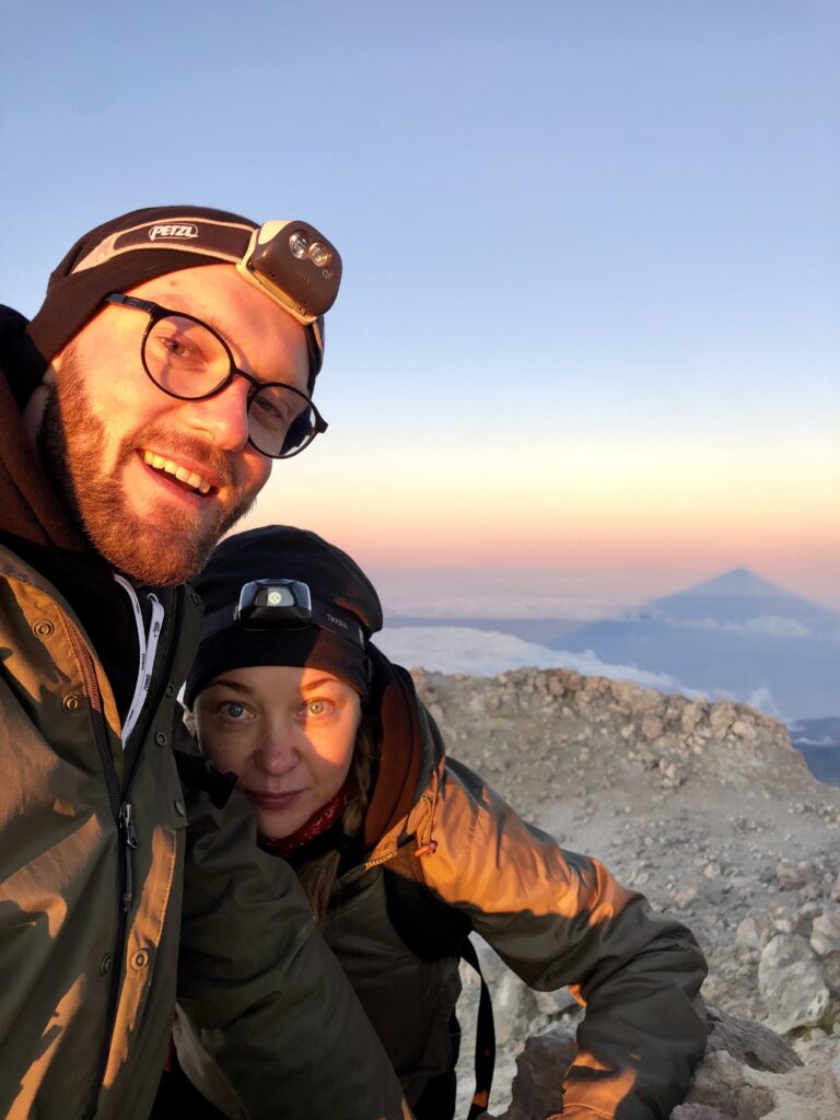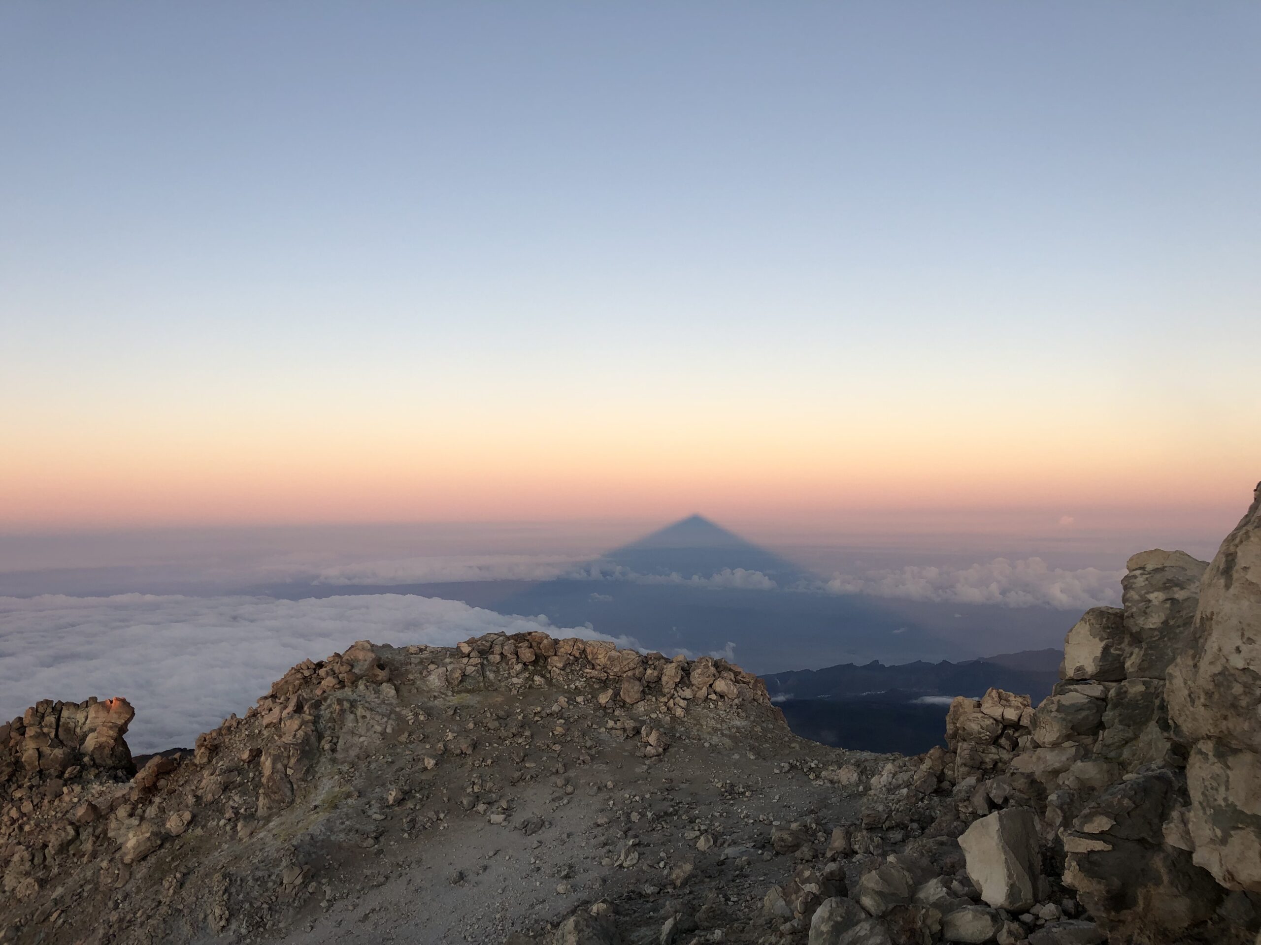 O godzinie 7.30 zdobywamy szczyt! Jesteśmy zmęczenia, ale emocje sprawiają, że na mojej twarzy pojawiają się łzy wzruszenia. To naprawdę ekscytujący moment. Niebo z pomarańczowego robi się ogniście czerwone, naszym oczom ukazuje się powoli wschodzące Słońce. Napawamy się urokiem tych bajecznych chwil na szczycie wulkanu, w towarzystwie satysfakcji z osiągniętego celu. Na kilka minut przed godziną 8 rano rozpoczyna się spektakularne widowisko, w którym główną rolę odgrywa iluminacja brzasku, cień góry i malownicze barwy nieba. Na zdjęciach udaje się uchwycić, ten zjawiskowy, ulotny moment, gdy gorące, rozżarzone słońce oświetla czubek wulkanu, na którym stoimy prezentując dumnie jego cień, na tle rozpraszających się chmur i błękitno – pomarańczowego nieba. Wyczerpująca, nocna wspinaczka, wynagrodzona takim, wręcz majestatycznym momentem.